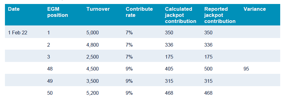 Suggested table to help validate jackpot contributions being dedicated from gaming revenue and accumulated to individual jackpot pools.